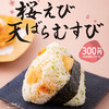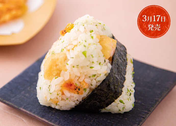 駿河湾産桜えびのかき揚げと、ぷりっと食感のえび天を あおさ海苔香るだしごはんでおむすびにしました。