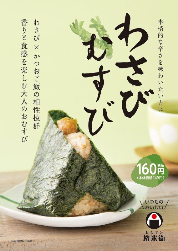 期間限定品「わさびむすび」(160円)を6月3日(木)より発売いたします! わさびとかつおご飯の相性抜群!わさびの香りと食感を楽しむ大人のおむすび。 本格的な辛さを味わいたい方におすすめです。 是非、ご賞味くださいませ。