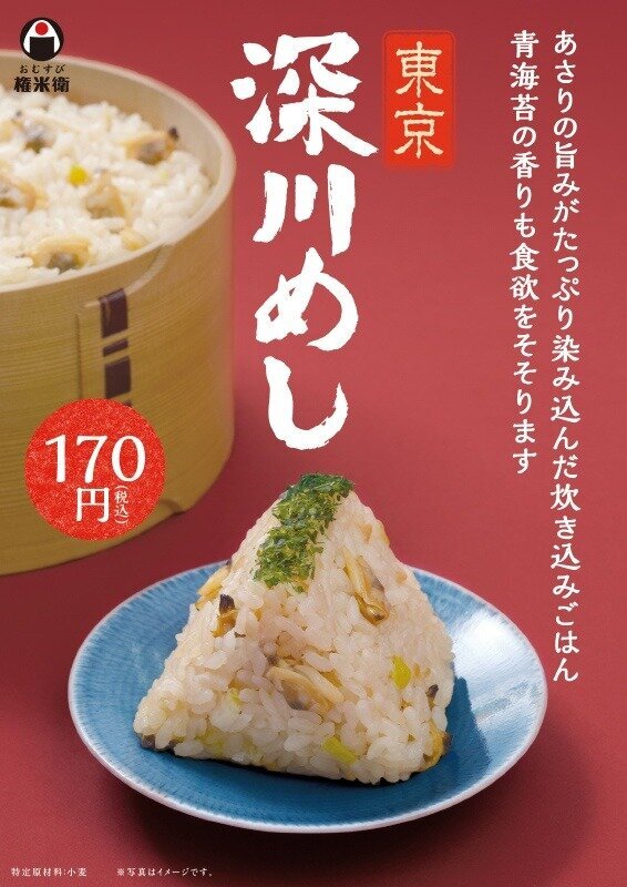期間限定品「深川めし」(170円)を5月11日(火)より発売いたします。 東京下町の郷土料理、深川めしをおむすびにしました。 旬のあさりの出汁が染み込み、ねぎがアクセントの炊き込みごはんです。 青海苔の風味も食欲をそそります。 是非、ご賞味くださいませ。