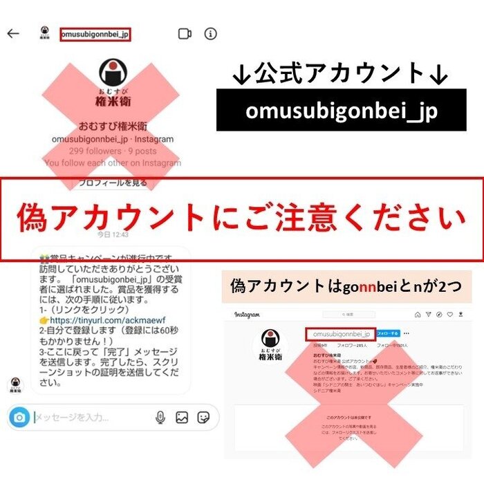 【重要なお知らせ】 おむすび権米衛公式SNSの「偽アカウント」にご注意ください