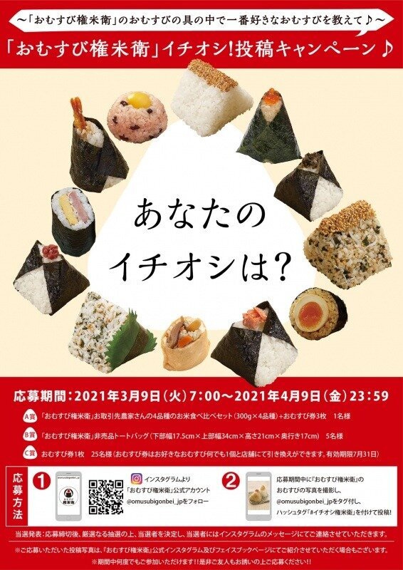 「おむすび権米衛」では、3月9日より「おむすび権米衛」非売品トートバッグやお米食べ比べセット、おむすび券など合計31名様に当たるインスタ写真投稿キャンペーンを実施いたします。
