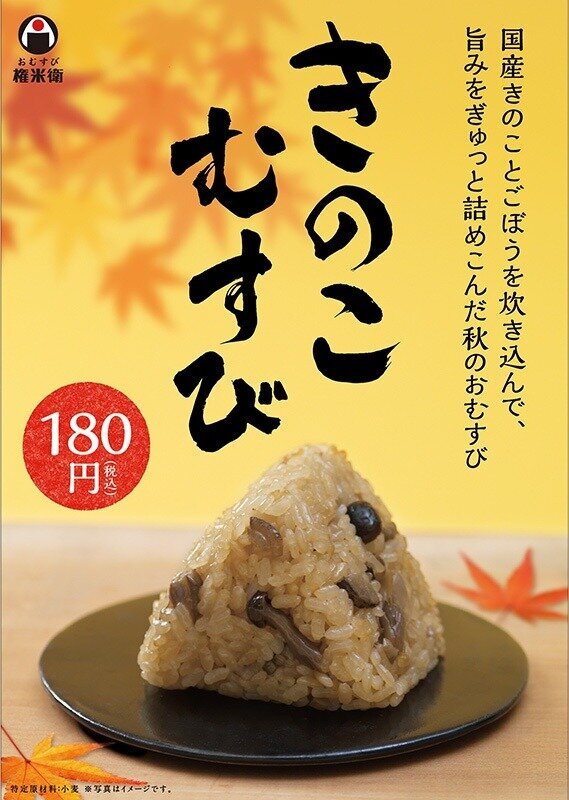 期間限定品「きのこむすび」(180円)を10月2日(水)より発売いたします! 国産のきのことごぼうを炊き込んで、旨みをぎゅっと詰め込んだ風味豊かな秋のおむすびです。