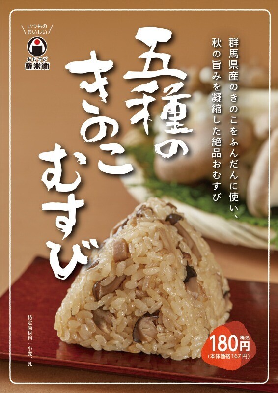 期間限定品「五種のきのこむすび」(180円)を9月7日(火)より販売いたします! 群馬県産の舞茸、椎茸、しめじ、エリンギ、えのきを醤油ベースのシンプルな炊き込みごはんにしました。きのこの香りと旨みを凝縮させた絶品おむすびです。