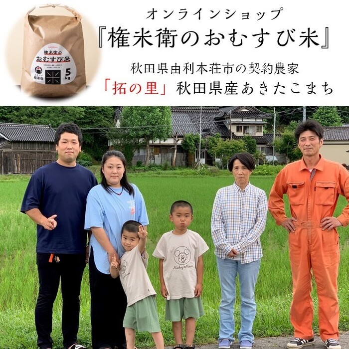 オンラインショップで販売する『権米衛のおむすび米』契約農家「拓の里」さんの秋田県産あきたこまちは、海に近い中山間地のミネラル豊富な土壌で、農薬と化学肥料を使わずに育てたお米です。