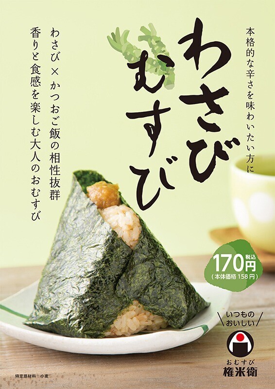期間限定品「わさびむすび」(170円)を5月24日(火)より販売いたします! 本格的な辛さを味わいたい方へ。 わさび×かつおご飯の相性抜群。 わさびの香りと茎わさびの食感を楽しむ、大人のおむすびです。 是非、ご賞味くださいませ。
