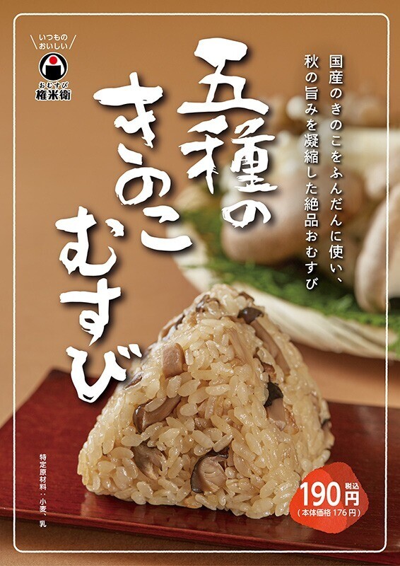 期間限定品「五種のきのこむすび」190円(税込)を9月27日(火)より販売致します! 国産のきのこをふんだんに使い、秋の旨みを凝縮した絶品おむすび。 是非、お召し上がりください!