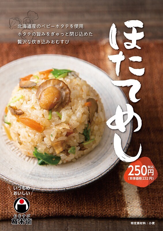 期間限定品「ほたてめし」250円(税込)を1月11日(水)より販売致します! 北海道産のベビーホタテを使用し、ホタテの旨みをぎゅっと閉じ込めた贅沢な炊き込みおむすび。 是非、ご賞味ください!