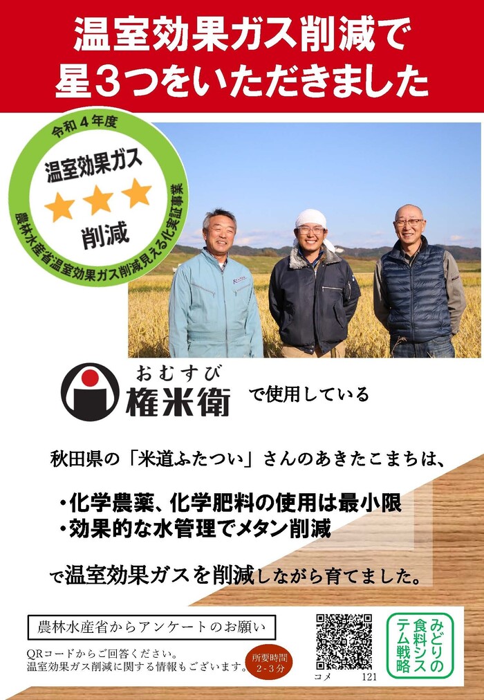 農林水産省が進める、温室効果ガス削減の「見える化」ラベル 星3つ獲得【米道ふたつい】(秋田県能代市)