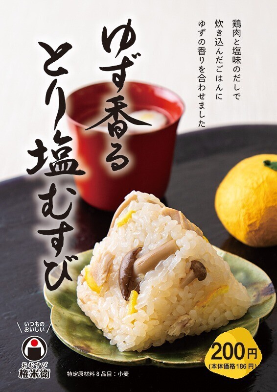 期間限定品「ゆず香る とり塩むすび」(200円)を10月24日(火)より販売いたします! 鶏のうま味と塩味の炊き込みごはんにゆずの香りをプラスした、上品な炊き込みおむすび。 是非、ご賞味ください!