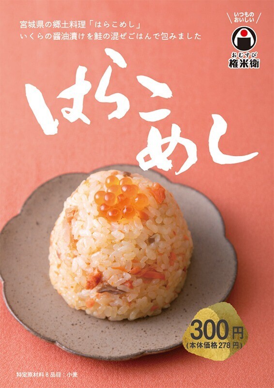 期間限定品「はらこめし」(300円)を2月6日(火)より販売いたします! 宮城県の郷土料理「はらこめし」。いくらの醤油漬けを鮭の混ぜごはんで包みました。 是非、ご賞味ください!