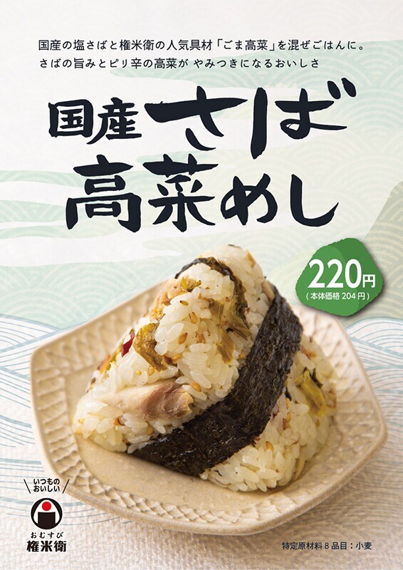 期間限定品「国産さば高菜めし」(220円)を9月3日(火)より販売いたします! 国産の塩さばと権米衛の人気具材「ごま高菜」を混ぜごはんに。 さばの旨みとピリ辛の高菜がやみつきになるおいしさです。 是非、ご賞味ください!