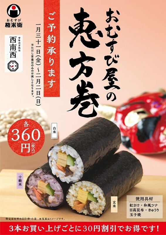 今年の節分は2月2日(日)です。 節分に食べると縁起のよい「恵方巻」(360円)を販売いたします! お渡し・販売期間 1月31日(金)~2月2日(日) ◆「ごはん」を三種よりお選びいただけます。 ・白米 ・玄米 ・十穀米 ◆人気のおむすび具材を使用し、店内で一本ずつ手巻き仕上げ。 使用具材:紅さけ、和風ツナ、日高昆布、きゅうり、玉子焼 ◆食べやすいハーフサイズ。 寸法 約10cm×径5cm 恵方巻 ▶予約用紙はこちら ご利用の店舗へお電話またはFAXで承ります。 ▶店舗情報はこちら