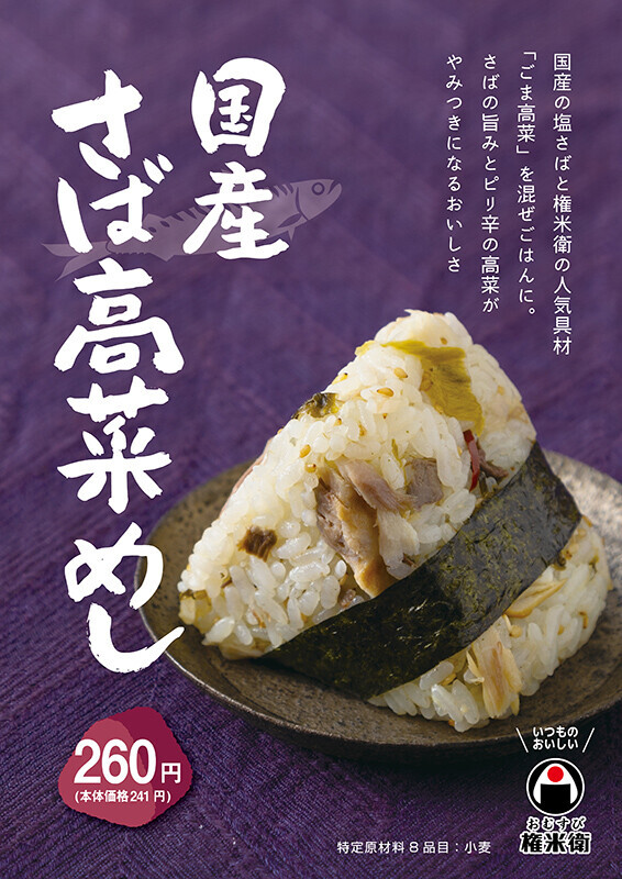 期間限定品「国産さば高菜めし」(260円)を10月7日(火)より販売いたします! 国産の塩さばと権米衛の人気具材「ごま高菜」を混ぜごはんに。 さばの旨みとピリ辛の高菜がやみつきになるおいしさ。 是非、ご賞味ください!