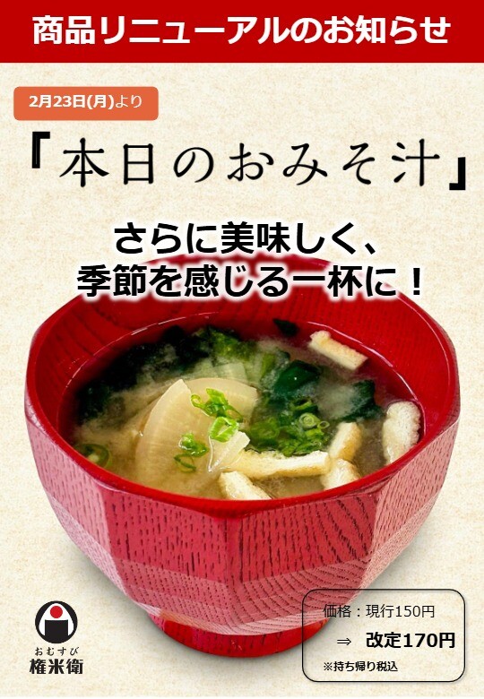 平素は格別のお引き立てを賜り、誠にありがとうございます。 このたび、より一層の品質向上のために、 下記商品をリニューアルさせていただくことになりました。 ■対象商品:本日のおみそ汁、季節の日替わりみそ汁 ■リニューアル日:2026年2月23日(月) ■リニューアル後の商品情報 商品名:本日のおみそ汁 価格:170円(持ち帰り税込) 変更点:手づくりで季節を感じるおみそ汁が さらに美味しくなりました。 今後も変わらぬご愛顧を賜りますよう、何卒よろしくお願い申し上げます。
